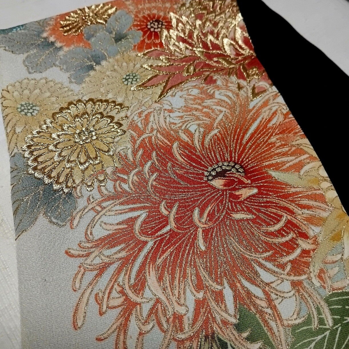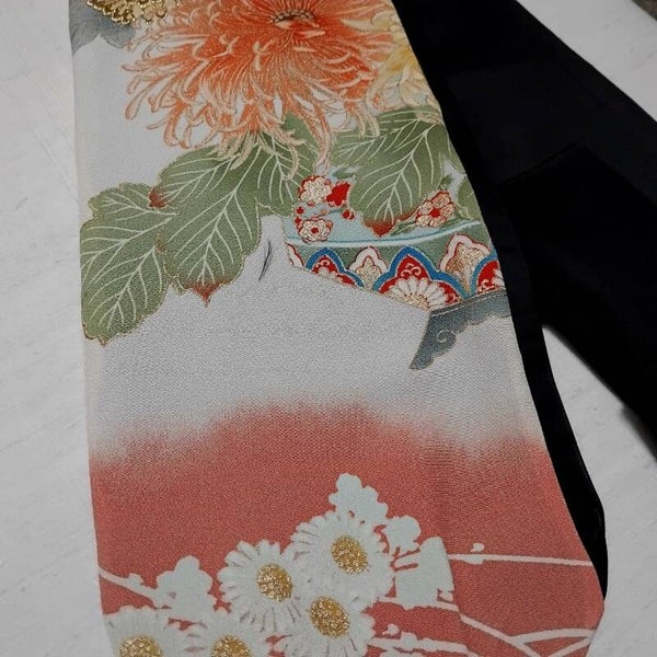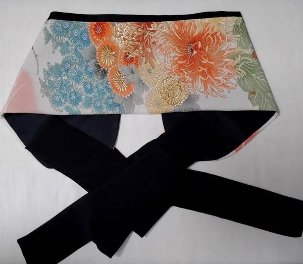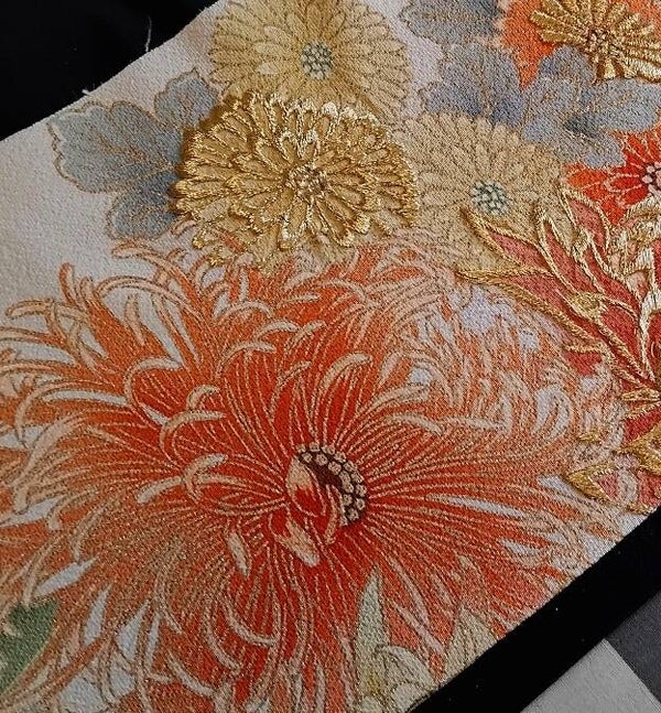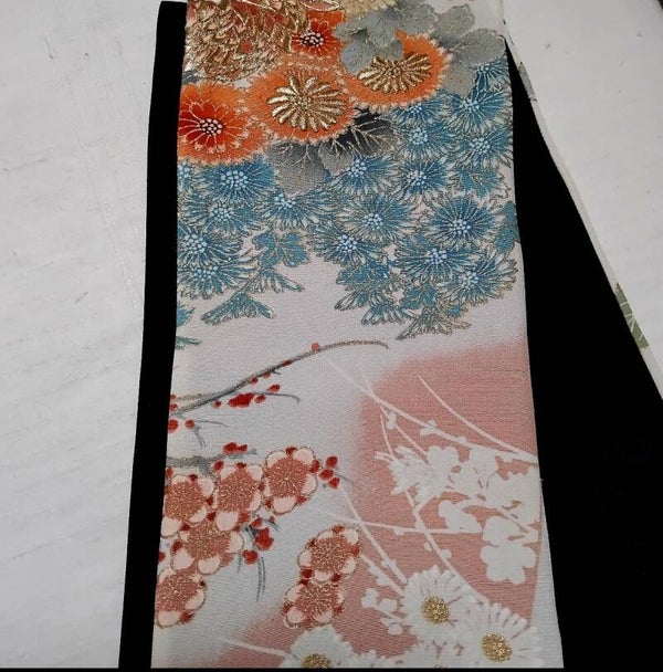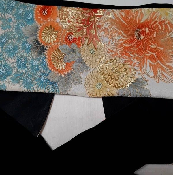 Het middenstuk voor van 80x17cm is met de hand geschilderd in Japan en geborduurd met goudgarens. Naar schatting is dit stuk 80-100 jaar oud. Het middenstuk achter is van zwarte stevigere glanszijde.