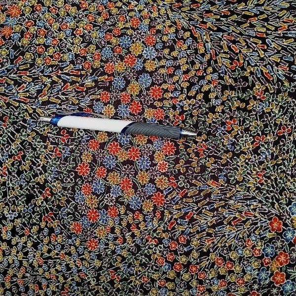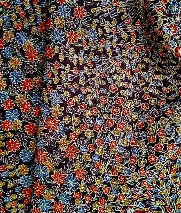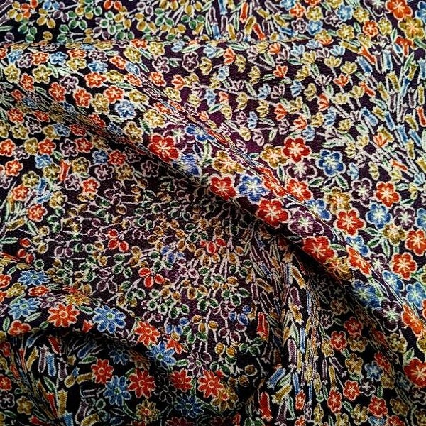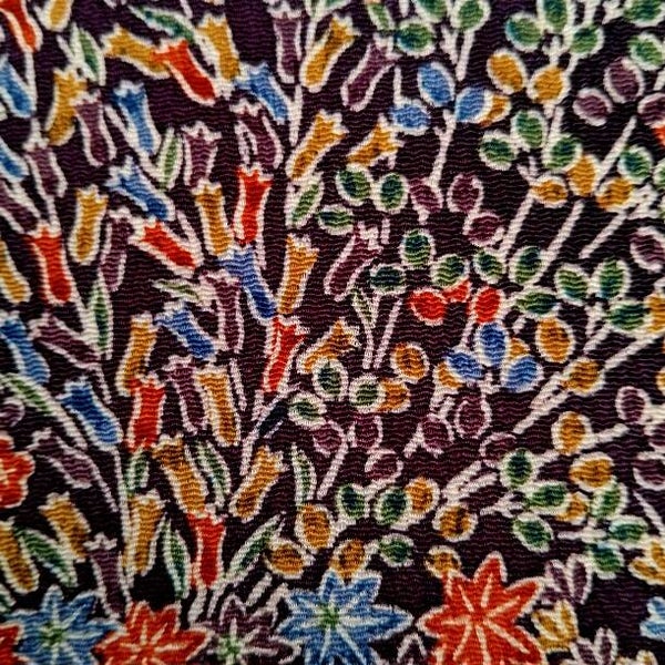 Antieke, soepele chirimen crepe zijde met verschillende kleine bloemen en bloesem. de kleur is donkerpaars.