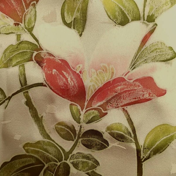 Prachtige antieke/vintage glanszijde in de kleur roomcreme met handgeschilderde bloem.