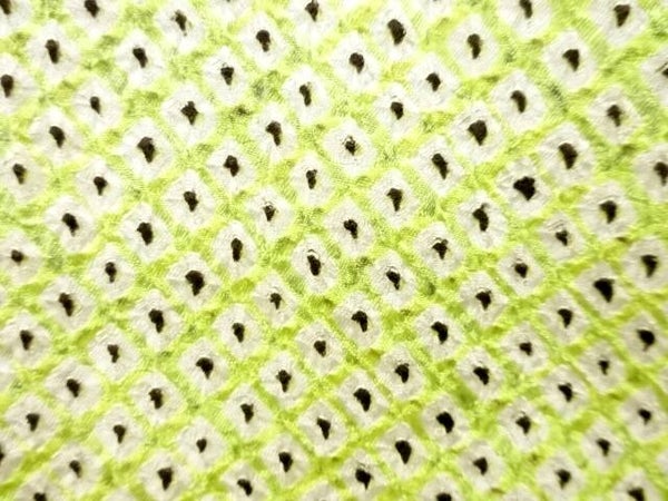 Vintage kimonozijde met handbewerkte shibori. De shibori is lichtgroen met witte vlakjes en zwarte hartjes.