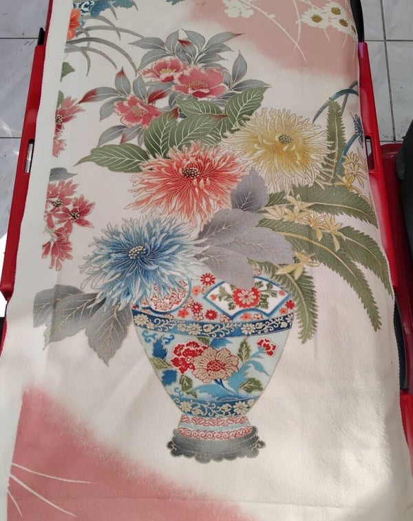 Werkelijk prachtige antieke, handgeschilderde kimonozijde, bewerkt met bladgoud. De afbeelding is een vaas met bloemen en losse bloemen. Op het midden zitten wat lichte stipjes, daarom iets goedkoper.
