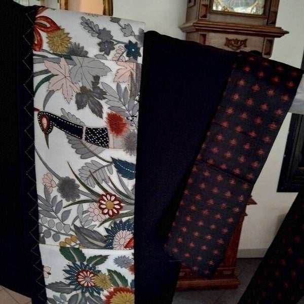 Het is een uniek exemplaar, het middendeel is gepatchworked uit 3 delen en opgebracht op stevige natuurlijke obizijde. De banden 100% soepele zwarte zijde met een klein werkje erin.