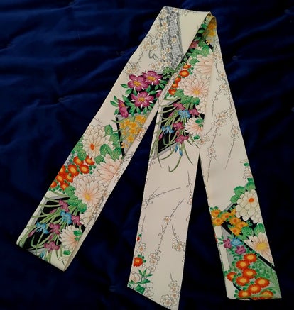 Prachtige zijden sjerp, ceintuur of smalle sjaal met natuurgekleurde, fantastische en adembenemende tinten. Gemaakt van antieke kimonozijde. Uniek, slechts 1 in voorraad
