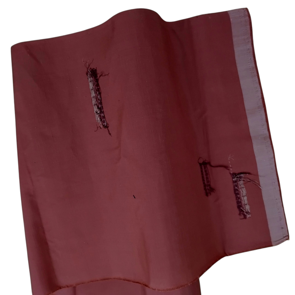 De zijde is heel subtiel ingeweven met figuurtjes met boogjes en een enkel lijntje, zo subtiel dat het lijkt of dat het erop is getekend met blauwe pen (zie foto 4). De zijde is rosy brown.