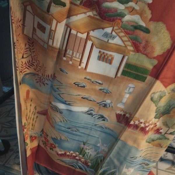 Antieke, lux aanvoelende soepele zijden iro-tomesode kimono met een prachtige doorlopende beschildering aan de onderkant van de kimono. De kunstenaar heeft een rivier en bomen, met aan de voorkant een huis op een heuvel. De kleur is warm oranjerood met tintje oud-rose erdoorheen .