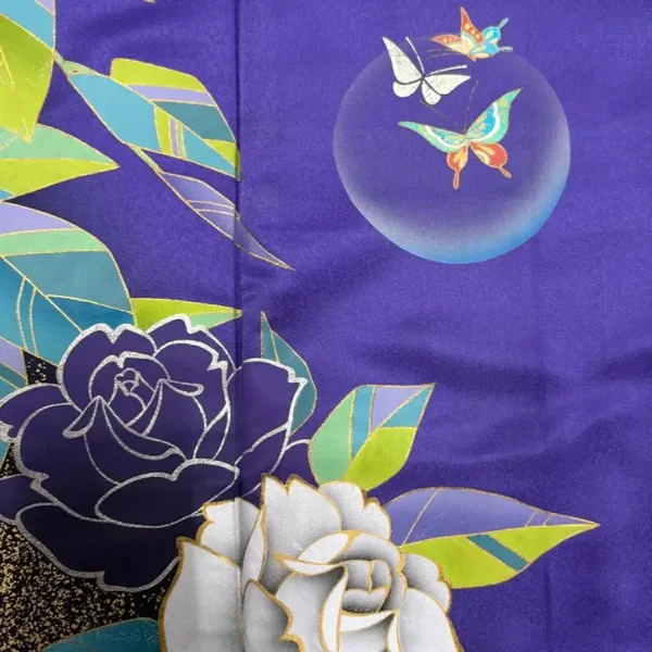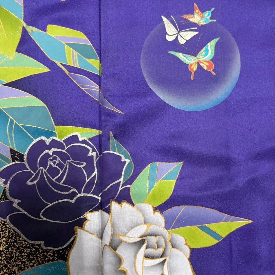 Prachtige vintage nieuwe furisode met grote getekende rozen. De kunstenaar heeft op enkele plekken waterbubbels of luchtbellen met vlinders aangebracht. De diepte van deze bubbels zijn adembenemend, net als de kleur van de kimono zelf. De onderrand is bewerkt met bladgoud.