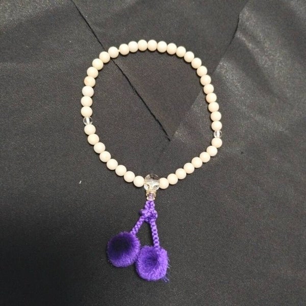 Deze gebedsketting heeft cremekleurige stenenkralen, gelijk de kleur van en is gemaakt in de post-war Showa periode (1940-1989).