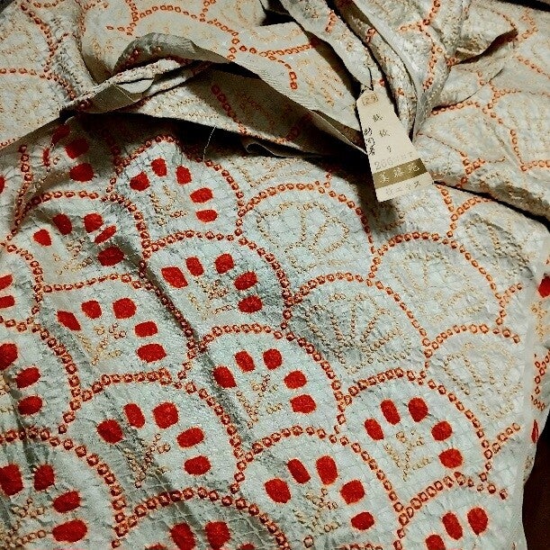 Nieuwe vintage (1950-80) shibori handwerk coupons met prachtig seigaiha motief. De kleur is gebroken creme met een licht tintje erdoor. De zijde kleurt mee met het licht en kan dan een lichte tint blauw, groen, grijs of beige krijgen. Een heel bijzondere natuurlijke zijden creatie.