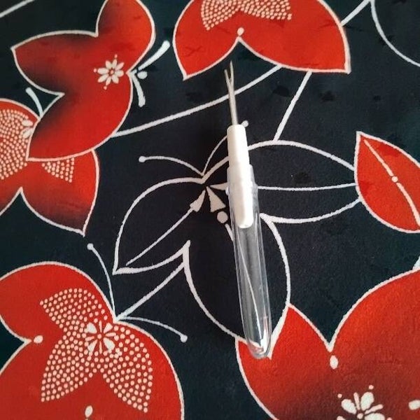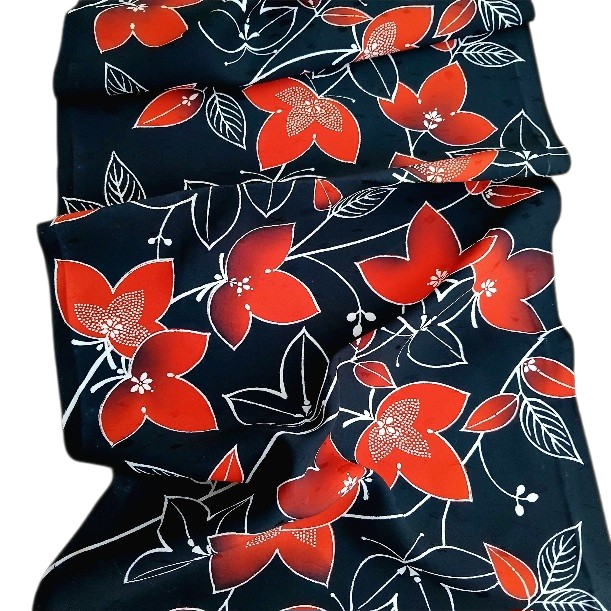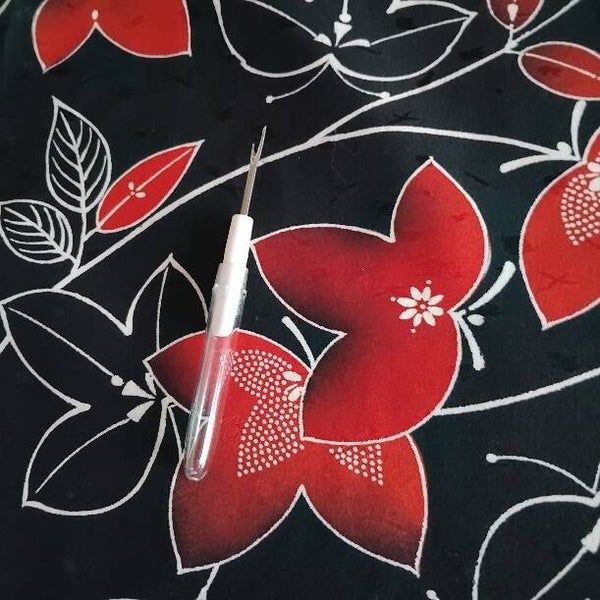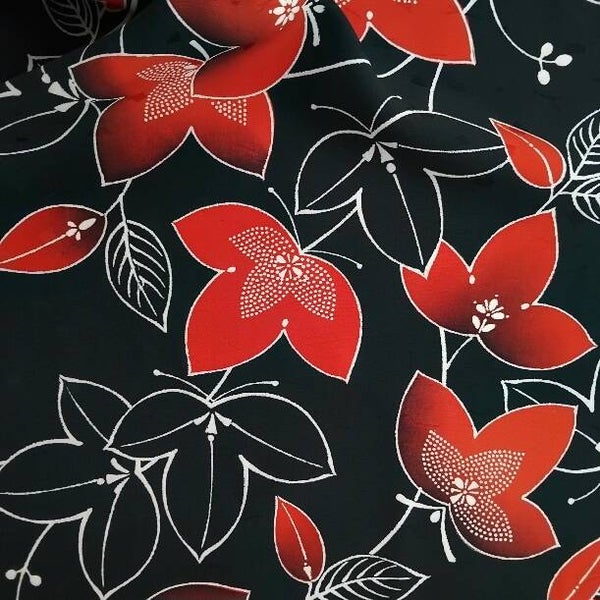 Nieuwe vintage soepele natuurlijke zijde. Deze diepzwarte zijde heeft een subtiele glans en is oorspronkelijk gemaakt voor een kimono door kimonomakers in Japan. Sommige bladeren hebben een gestipt motief. De bladeren zijn in yuzen gedrukt.